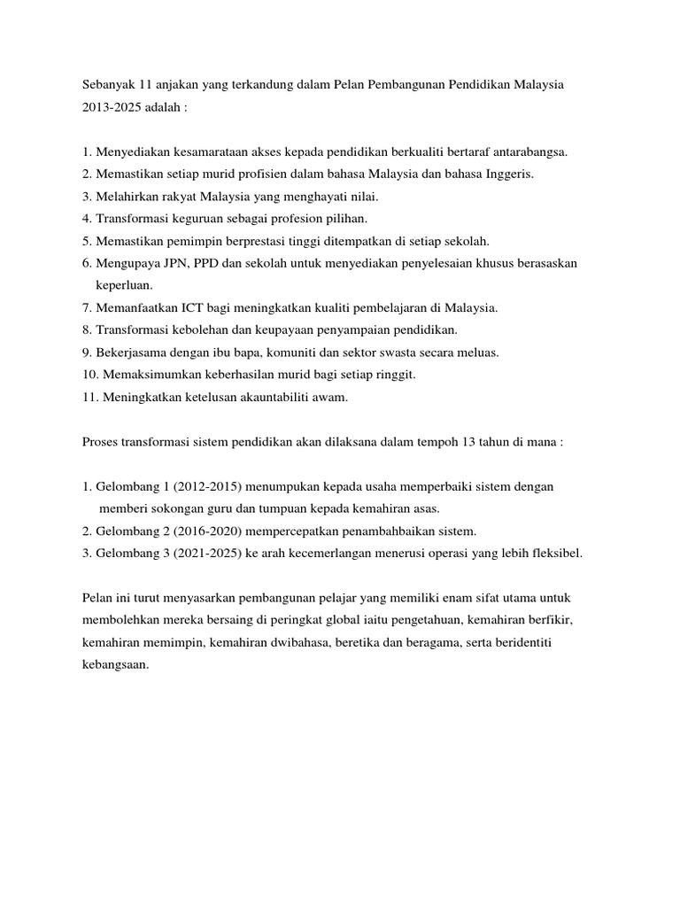 Ringkasan Pppm 2013 2025 from demo.dokumen.tips Posted by hissham z at 2:04 am. Semua cadangan yang telah dikemukakan oleh pelbagai pihak telah diteliti dan digabungkan berdasarkan empat kriteria utama. Transformasi sistem pendidikan negara untuk tempoh 15 tahun akan datang. Transformasi profesion keguruan menjadi profesion pilihan. Melahirkan rakyat malaysia dengan penghayatan nilai. Post comments (atom) pautan untuk cikgu. 11 anjakan transformasi sistem 11 anjakan untuk transformasi sistem pendidikan negara. Pelan itu akan menyaksikan sebanyak 11 anjakan melibatkan transformasi dari segi system pendidikan negara.