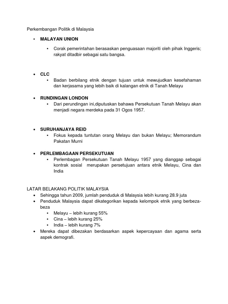 Jadual 3.1 menunjukkan tahap literasi umum pada tahun 1959 ialah 48.3 Apr 14, 2014 · perkembangan politik di malaysia kesatuan melayu singapura jawatankuasa perhubungan antara kaum (clc) persidangan meja bulat antara kaum di tanah melayu mencari alternatif untuk menggerakkan kerjasama dan perpaduan antara kaum di tanah melayu independence of malaya party (imp) Malaysia mempunyai masyarakat majmuk berbilang kaum. Perkembangan gerakan islah terhadap pentadbiran kerajaan. Ini telah menjadi salah satu faktor dalam pembangunan negara terutama dalam politik.