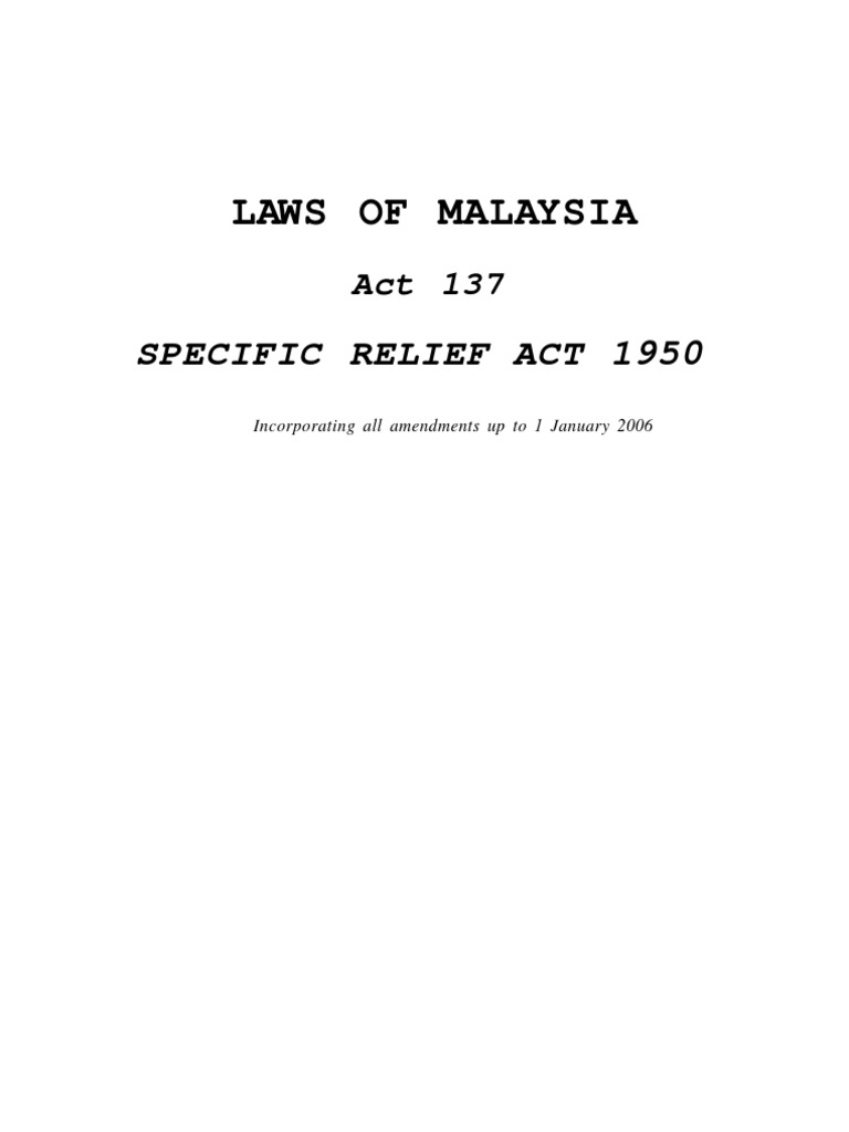 Specific relief act is 2. Those are the provisions related to granting of a mandatory injunction and on specific performance of contracts. Enforceable by law becomes void when it ceases to be enforceable. Incorporating all amendments up to 1 january 2006 2 laws of malaysia act 137. A court may not grant to a plaintiff who has failed to aver and to prove that he has performed or has always been ready and willing to perform his part of the agreement the specific performance whereof he seeks.